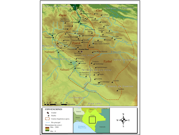Mapa 1 Distribución y localización proyectadas de los pueblos tzeltales y tzotziles hacia 1610