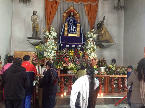 Luego de un rato de absoluta quietud, dos señoras rezan unos minutos hincadas ante la imagen del Justo Juez; antes de que salgan, llegan otras personas, un par de señoras solas, luego una familia de cinco integrantes.5