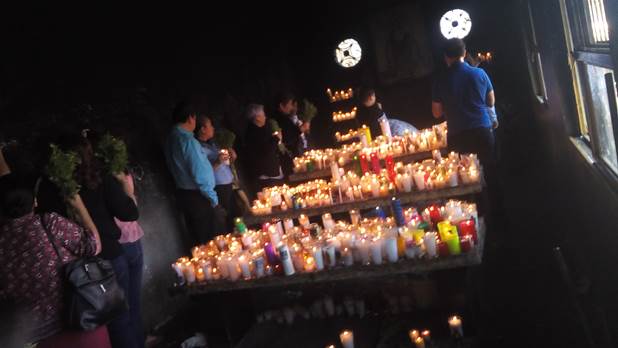 En una visita de campo, paso por un espacio llamado por los fieles “capilla de velas” del Justo Juez, que en ese momento está solo poblada por velas encendidas para la imagen; cruzo con unas personas que van saliendo de la capilla interior e ingreso a esta.