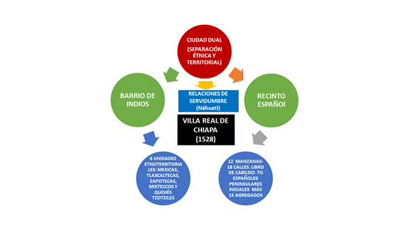 En las ciudades novohispanas, junto al asentamiento español, fue generalizada la ocupación de la periferia por los indios aliados que acompañaron a los españoles en la empresa de conquista. Ciudad Real no sería la excepción y los barrios conformarían inicialmente un grupo humano a prudente distancia territorial y social del asentamiento español, ubicado en el centro o Recinto. Según Aubry (1991: 25), el Recinto “comprendía 12 manzanas y 18 calles”, y lo habitaban -de acuerdo con el Libro de Cabildo- inicialmente 70 españoles peninsulares a los que luego se agregarían otros 13, posiblemente soldados de Portocarrero que decidieron quedarse a vivir en la nueva Villa. Y si bien en un principio la colonia procuró mantener separado al Barrio del pequeño grupo de conquistadores, lo cierto es que al poco tiempo se producirían entre indios y españoles relaciones de esclavitud y servidumbre.