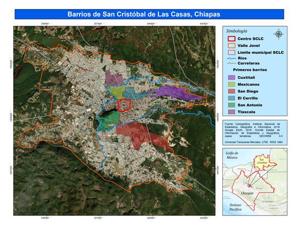 Los barrios, denominados inicialmente como de “indios”, nacieron en la periferia de San Cristóbal de Las Casas y conformaron sus primeros enclaves territoriales. Por la singular geografía del valle, estos asentamientos constituyeron, sin que haya evidencia de que alguien se lo propusiera, una frontera “extramuros” que separaba a los indios de los españoles y protegía a la ciudad de los grupos hostiles que habitaban las inmediaciones (Aubry, 1991). Posteriormente, los barrios de indios experimentaron un proceso de mestizaje, de modo que se conurbarían con el recinto español, dando lugar a nuevos asentamientos que también se denominaron barrios.