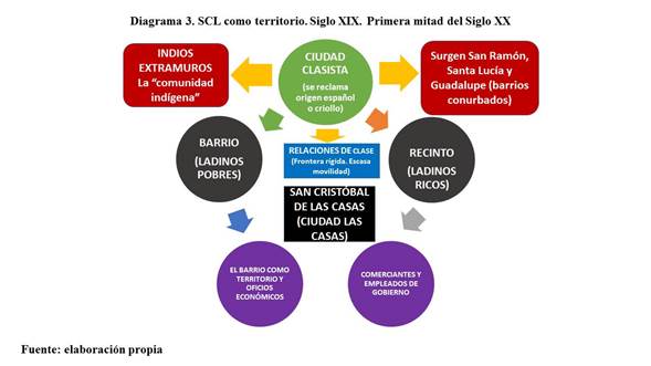 Durante el siglo XIX y hasta buena parte del siglo XX, tanto los habitantes del Centro como de los barrios se asumen como ladinos -noción a menudo tomada localmente como equivalente de mestizo-. Mientras tanto, el indígena o indio citadino -entendido como lo opuesto al ladino- se ha ruralizado, es extraterritorial, vive en el llamado paraje o comunidad, y su presencia en la ciudad es concebida como transitoria o circunstancial.