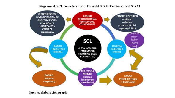 Recinto y Barrio serían, entonces, las dos modalidades que dieron su origen a la ciudad colonial como territorio, transformando el espacio físico de la cuenca en un espacio social compartido, pero jerárquico y con obvias relaciones de dominación del español hacia los nativos. En términos de Raffestin (2011) y su concepción del espacio como una “geografía del poder”, estamos frente a un espacio social donde coexisten la diversidad y la asimetría como formas de interacción cotidiana. Diagrama 1