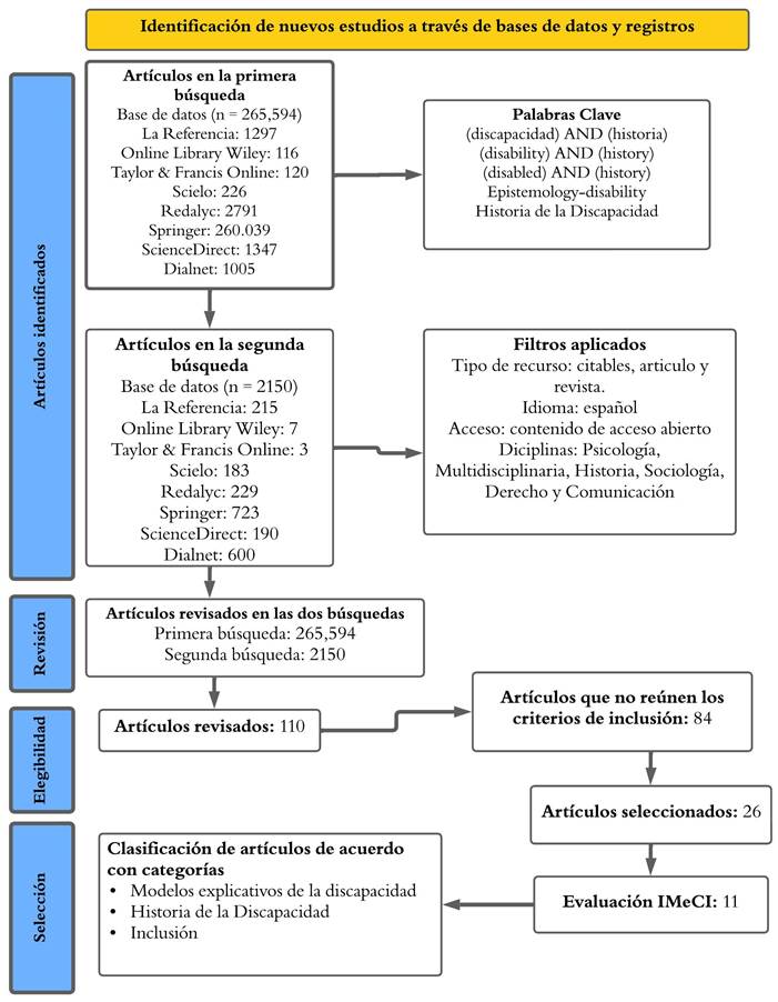 Para esta fase en la construcción de la RS, se consideraron artículos de estudios primarios en bases de datos de acceso abierto. Previamente, se consultó la lista controlada y estructurada de términos de la Organización de las Naciones Unidas para la Educación, la Ciencia y la Cultura (Tesauro UNESCO), para proceder a una búsqueda de publicaciones con base a la combinación de los términos y palabras clave: discapacidad, historia, historia de la discapacidad, disability, history, disabled y epistemology, incluyendo como criterios que la publicación haya sido originalmente hecha en idioma español y en el periodo en los años 2006 a 2023. Asimismo, haciendo uso del operador booleano AND, se combinaron los términos en los algoritmos de búsqueda: (Discapacidad) AND (Historia); Historia de la Discapacidad; (Disability) AND (History); (Disabled) AND (History) y Epistemology-disability. Para la fase de elegibilidad, como se detalla más adelante, los filtros aplicados en cada búsqueda conciernen a: textos de acceso abierto y completos, artículo de revista, tipo de recurso artículo, campos disciplinares en Psicología, Multidisciplinaria, Historia, Sociología, Comunicación y Derecho.