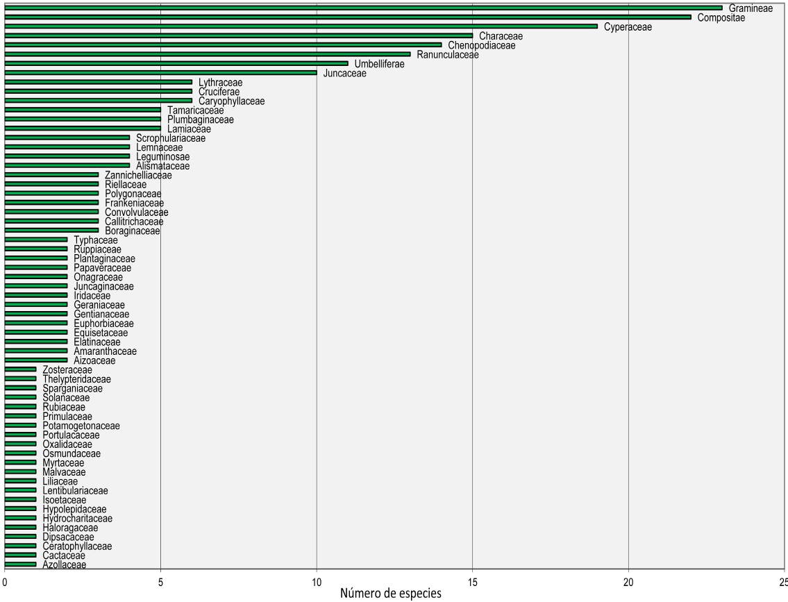 Destaca también la frecuencia de especies pertenecientes a familias como: Umbelliferae, Lythraceae, Plumbaginaceae, Tamaricaceae, Lemnaceae, Callitrichaceae, Alismataceae o Zanichelliaceae, hecho gue confiere los rasgos distintivos de la flora de este tipo de hábitat. Los géneros mejor representados son Chara y Ranunculus, con 11 especies, y Juncus, con 10. La Figura 2 muestra el conjunto de todas las familias con su frecuencia.