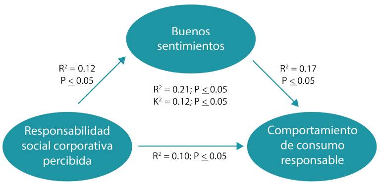 La RSC percibida tuvo un efecto positivo y significativo en el comportamiento de consumo de los jóvenes participantes de este estudio, lo que coincide con la literatura previa (Martínez y col., 2014; Lock y Seele, 2016); sin embargo, se observó que parte de este efecto fue absorbido por la variable buenos sentimientos. Es decir, al incluir tal variable como mediadora entre la relación de la RSC percibida y el comportamiento de consumo responsable, este efecto indirecto fue mucho mayor que el efecto predictor en una relación directa, lo que es semejante a los resultados de Habel y col. (2015), quienes utilizando esta misma variable, demostraron efectos positivos y significativos sobre la propensión a pagar un mayor precio.