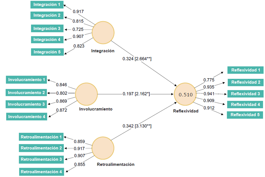 | H3. La retroalimentación influye positiva y significativamente en la reflexividad. | 0.342 | 3.130** | No rechazo |