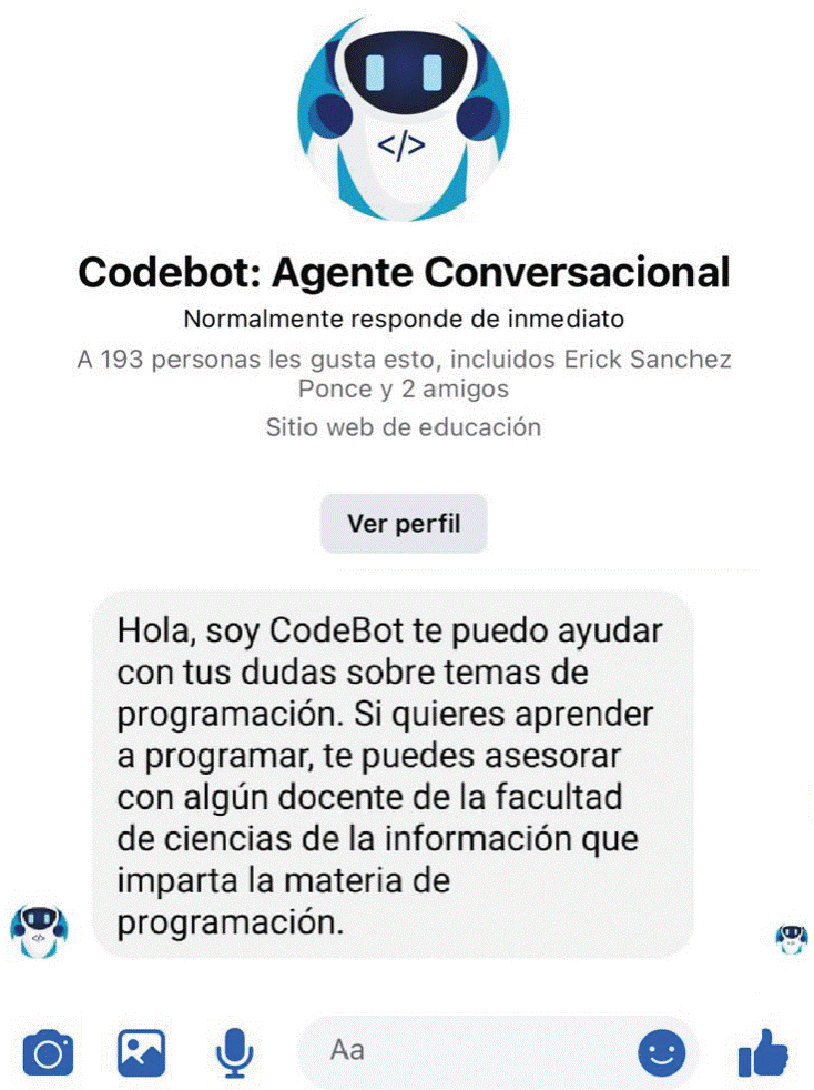 Se evaluaron los requerimientos técnicos para el diseño y creación del agente conversacional en la plataforma Dialogflow de Google (Google-Cloud, 2022) y se implementó en la red social Facebook, dado que es la red utilizada institucionalmente y también a nivel facultad. El agente conversacional fue entrenado acorde al temario del curso de Programación I, que se imparte en la facultad. En la etapa inicial, la base de conocimiento de Codebot estuvo formada por 80 intenciones, así como dos entidades.