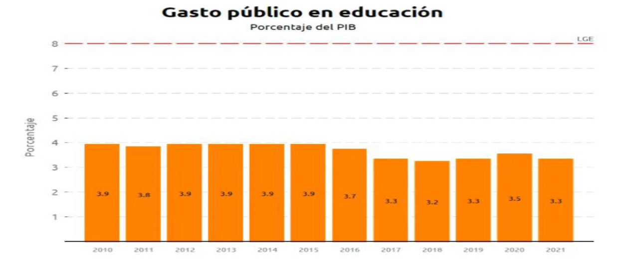 Cabe señalar además, que la inversión en gasto público en educación no ha tenido incremento sensible en la presente administración federal como se advierte en el siguiente gráfico: