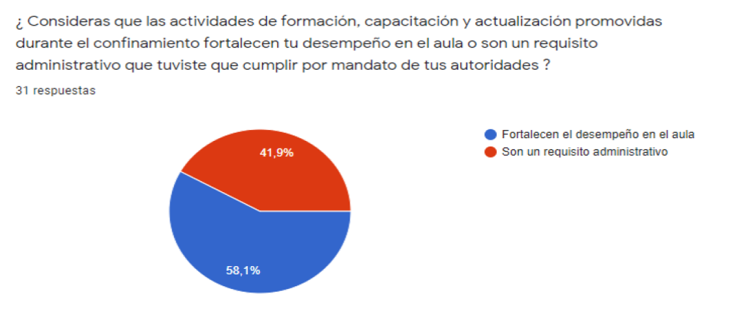 II. Con la reforma de 2013 se prometió “un traje a la medida” en lo que hace a desarrollo y superación profesional a partir de formación, capacitación y actualización; sin embargo, lo anterior quedó en una promesa incumplida, tanto en el sexenio anterior, como en el que va del presente. En el estudio se preguntó el específico y se encontró que 13 de los 31 implicados consideran, que ha existido un abuso de los denominados “webinars” que casi a diario se han presentado en tiempos de pandemia y que lejos de profesionalizar al docente se han advertido más como carga administrativa, dejando de lado una propuesta de formación continua y desarrollo profesional situada, que históricamente ha sido un reclamo del sector magisterial. Esto se puede apreciar en la Gráfica 3.