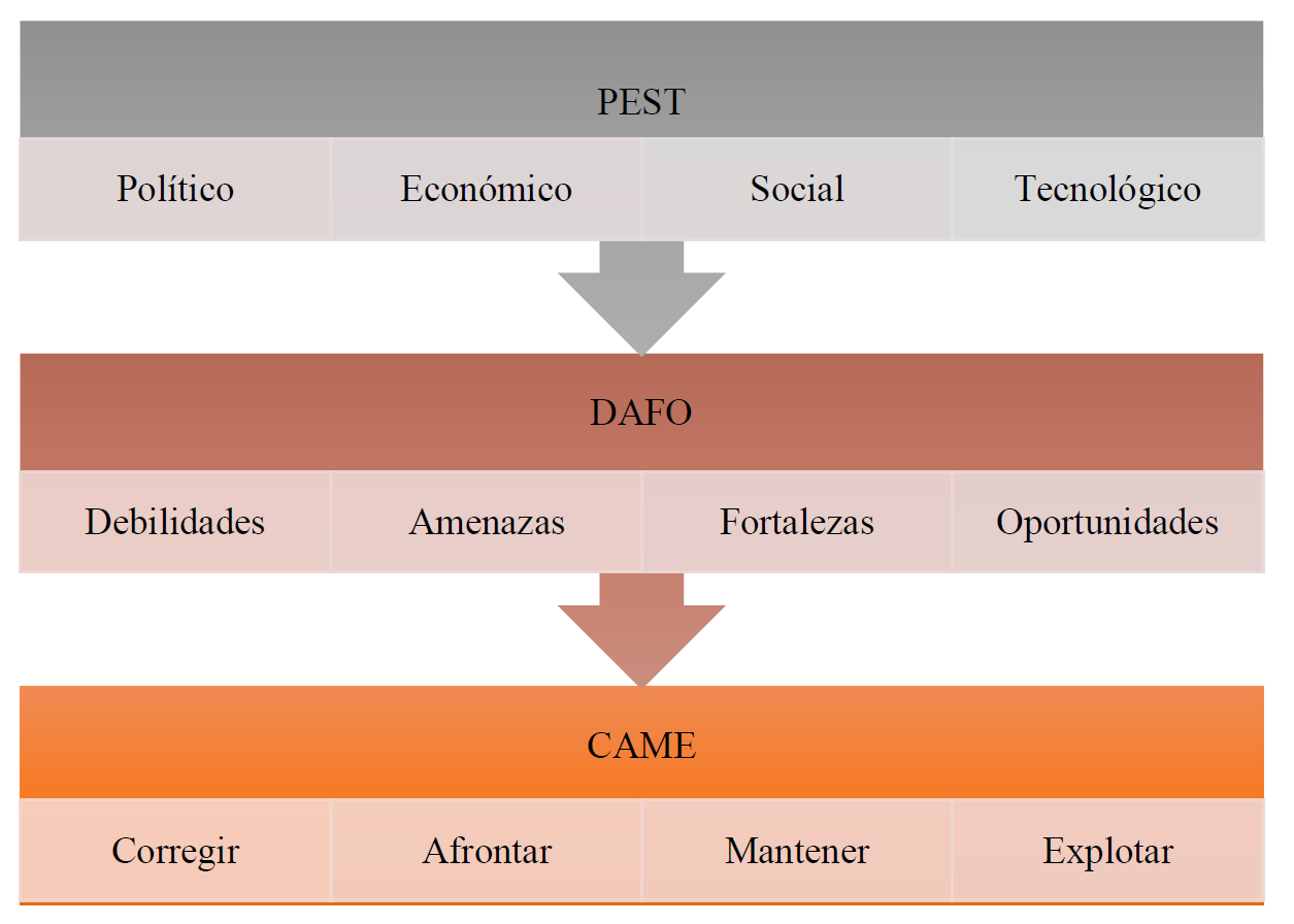 Para llevar a cabo este análisis, se propone la combinación de las técnicas PEST-DAFO-CAME para mostrar el contexto y determinar los componentes de interés para la investigación en curso (Alava, et al., 2018; Ortega, et al., 2019). Se persigue examinar desde la óptica de la Figura 1, los retos y sus posibles estrategias (García, 2017).