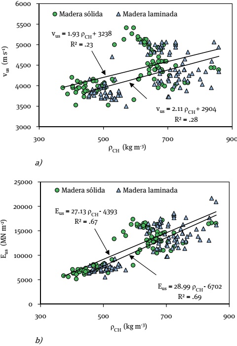 Figura 2 Correlaciones y coeficientes de determinación (R2) para madera sólida y laminada entre: a) velocidades del ultrasonido (VUS) y b) módulos dinámicos (EUS), ambos en función de las densidades aparentes (ρCH)