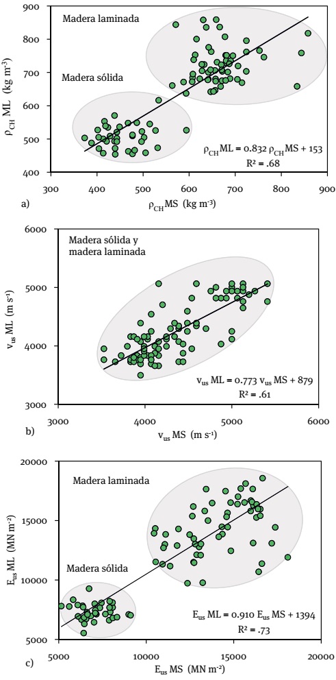 Para las tres variables (ρCH, VUS y EUS) las tendencias son positivas. Sin embargo, para la densidad aparente y el módulo dinámico, se distinguen dos nubes correspondientes a la madera sólida y a la madera laminada. En cambio, para la velocidad del ultrasonido, los valores correspondientes a la madera sólida y a la madera laminada se confunden. Estos resultados coinciden con los del análisis estadístico y describen los datos de la Tabla 3.