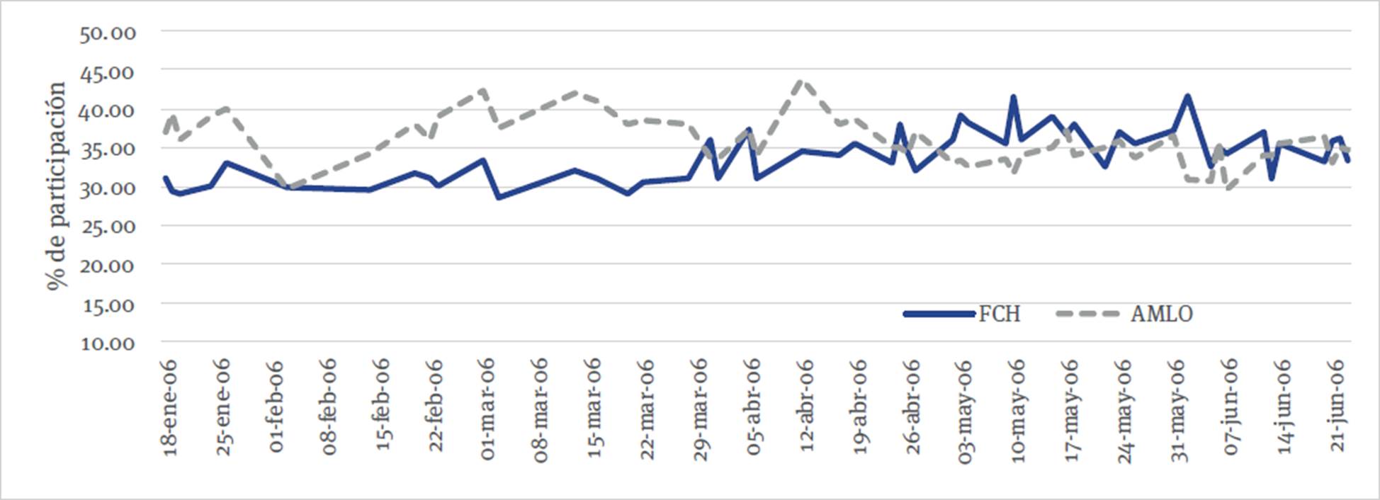 Respecto a la elección presidencial de 2006, hay que mencionar que ha sido la más cerrada en lo que podemos llamar la breve historia democrática del país, tanto por los resultados de las encuestas electorales a lo largo de la contienda, como por los resultados finales obtenidos con un margen de diferencia de apenas medio punto porcentual aproximadamente entre los dos principales candidatos. En la Gráfica 1 podemos observar el comportamiento de las encuestas electorales en un lapso de seis meses antes, hasta el día de la elección el 2 de julio de 2006.