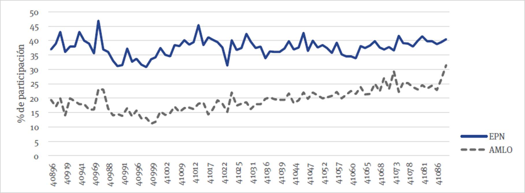 Para la elección del 2018, el candidato de izquierda AMLO vuelve al escenario electoral para enfrentarse con su más cercano competidor en este proceso, el candidato del PAN Ricardo Anaya Cortés. En la Gráfica 3 se muestran los resultados de las encuestas electorales para el 2018 y podemos observar que a diferencia del periodo de 2012 ahora es el candidato de izquierda AMLO el que prácticamente toda la campaña electoral y hasta el desenlace de la elección se mantuvo arriba en las preferencias electorales.