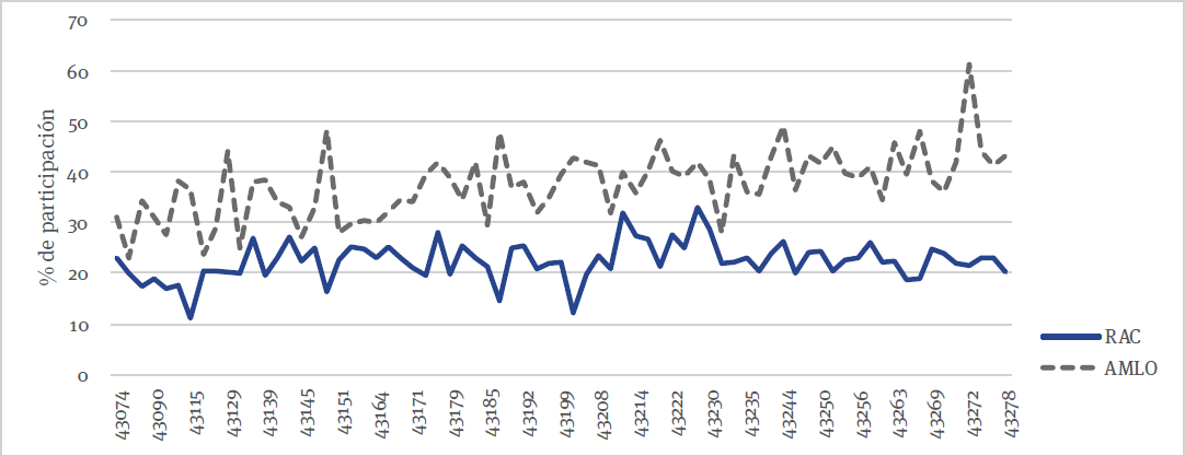 Partido de la Revolución Democrática; PRI: Partido Revolucionario Institucional; PAN: Partido Acción Nacional. *AMLO: Andrés Manuel López Obrador, candidato presidencial por el PRD para las elecciones de 2006 y 2012 y por el partido MORENA para la elección del 2018; EPN: Enrique Peña Nieto, candidato presidencial por el PRI para la elección presidencial de 2018; FCH: Felipe Calderón Hinojosa, candidato presidencial por el PAN para la elección de 2006; RAC: Ricardo Anaya Cortés, candidato presidencial por el PAN para la elección de 2018.