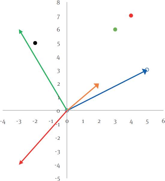 En el HJ-biplot, el coeficiente de correlación de Pearson de dos variables es aproximadamente igual al coseno del ángulo formado entre las flechas que las representan, mientras que la distancia de Mahalanobis entre dos individuos es la distancia entre los puntos que los representan. En la Figura 1 se muestran algunas flechas y puntos en un HJ-biplot. El ángulo entre las flechas azul y naranja es cercano a 0o, lo que indica que el coeficiente de correlación de Pearson que les corresponde es cercano a cos 0º=1, es decir, tienen una correlación positiva alta. En cambio, el ángulo entre las flechas azul y roja es cercano a 180o y su coeficiente de correlación de Pearson es cercano a cos 180º=-1 , por lo que la correlación entre ellas es negativa. Entre las flechas azul y verde el ángulo es aproximadamente de 90o y su coeficiente de correlación de Pearson es cercano a cos 90º=0, es decir, son independientes estas variables. Por otra parte, los puntos rojo y verde están cercanos entre sí, lo que indica que su distancia de Mahalanobis es pequeña y, por lo tanto, tienen valores similares en las variables analizadas. Por otro lado, la distancia entre los puntos rojo y negro es mayor y por eso tiene mayores diferencias entre sus valores en las variables consideradas.