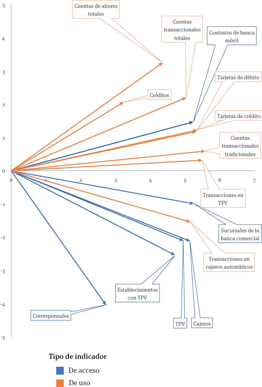 Para el año 2020, los datos del Cuadro 2 y la Figura 4 muestran que los indicadores que más contribuyeron a la primera componente principal fueron: transacciones en TPV (5.40); cuentas transaccionales tradicionales (5.51), tarjetas de crédito (5.31), tarjetas de débito (5.23) y sucursales de la banca comercial (5.26). En el caso de la segunda componente principal, ahora queda definida por los indicadores créditos (2.64) y corresponsales (-3.83) (uno de uso y otro de acceso).