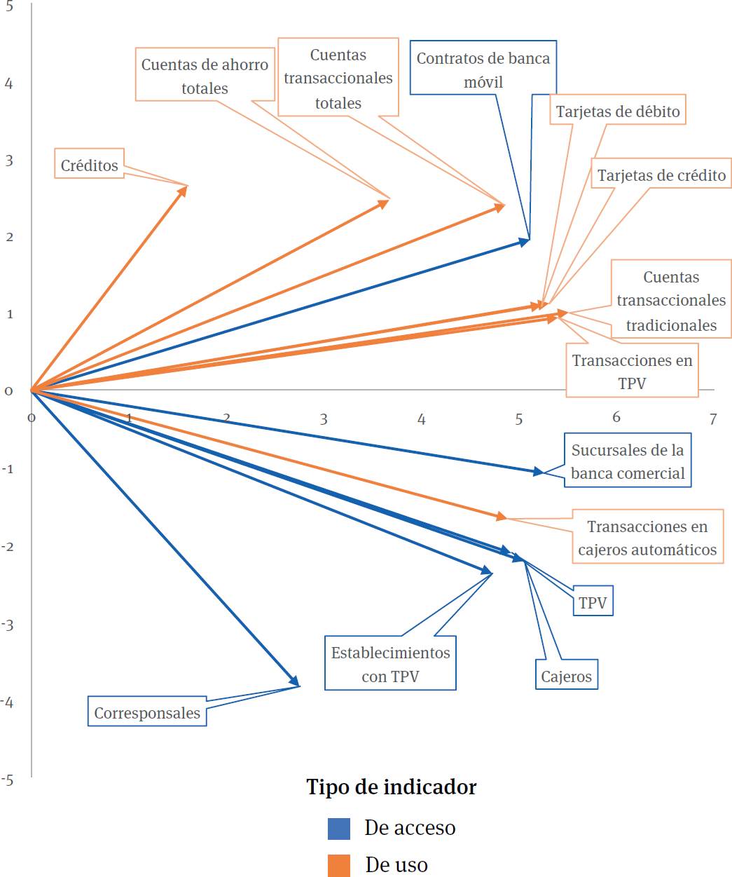 La Figura 3 muestra el HJ-biplot de los indicadores de inclusión financiera del año 2019. Las flechas de color naranja corresponden a los indicadores de uso y las azules a los de acceso. A partir de esta representación se pueden detectar fácilmente correlaciones entre pares de indicadores, sin necesidad de calcular los coeficientes de correlación de Pearson entre todos los posibles pares. Basta con observar el ángulo que se forma entre las flechas que les corresponden.