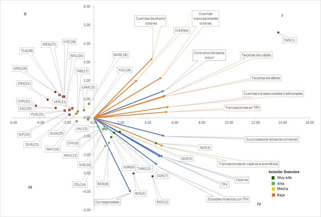 La mayor parte de los estados están ubicados en los cuadrantes II y IV, mientras que solo hay un estado en el cuadrante I (Ciudad de México) y dos en el cuadrante III (Nayarit y Yucatán). Esto indica que las características de inclusión financiera son heterogéneas en el conjunto de las entidades federativas de México, pero se pueden distinguir dos grupos principales y algunos casos especiales. Además, los estados que están representados por puntos cercanos entre sí tuvieron características similares de inclusión financiera, de acuerdo con los indicadores analizados. Un ejemplo de esto son Hidalgo (26), Ciudad de México (27) y Tlaxcala (28), que además fueron clasificados por Banamex con el mismo nivel de inclusión financiera y en posiciones consecutivas en el mencionado índice.