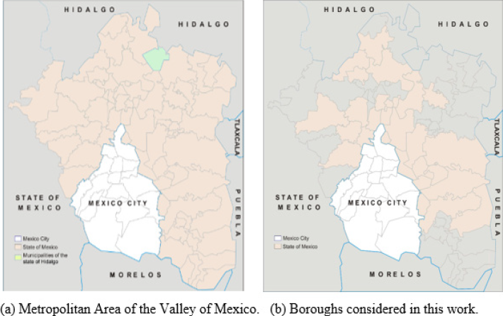 Although the federal government made available a database regarding the COVID-19 disease during the first year of the pandemic, the database was incomplete or had some inconsistencies. Due to the unavailability of data for some explicative variables considered in our model, 34 municipalities were not considered in this study. Figure 1 (a) shows the MAVM; the remaining 42 boroughs considered can be seen in (b), 16 from Mexico City (in white) and 26 from the State of Mexico in (light orange).