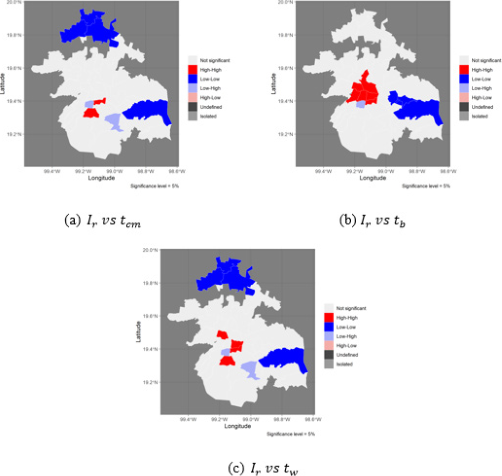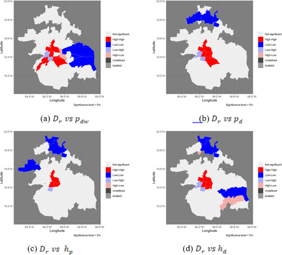 This study is complemented by Appendix A, where local spatial associations between the COVID-19 incidence/mortality rate variables are shown. Each variable was found to be significant in the proposed models by computing the bivariate local Moran’s I value. It is worth mentioning that, in this work, we use the I Moran test to determine the spatial autocorrelation, generating the matrix of spatial weights using the Queen criterion. Geographically speaking, two municipalities are neighbors if they share a point on their borders; however, the test returned a p-value beyond 0.01. This means that the hypothesis of non-autocorrelation of errors is not rejected, so we did not find enough evidence of spatial autocorrelation. Other criteria could be sought for future work to build the weight matrix and investigate spatial autocorrelation. For example, in Naveen and Gurtoo (2022), passenger clusters are considered based on their travel dynamics to guide those responsible for transport planning to provide a more efficient service, in the presence of COVID-19, rather than control access. In Iacus et al. (2021), they define the concept of Mobility Functional Areas as the geographic zones highly interconnected according to the analysis of mobile positioning data and affirm that they can be used to inform local transportation, spatial planning, and health and economic policies.