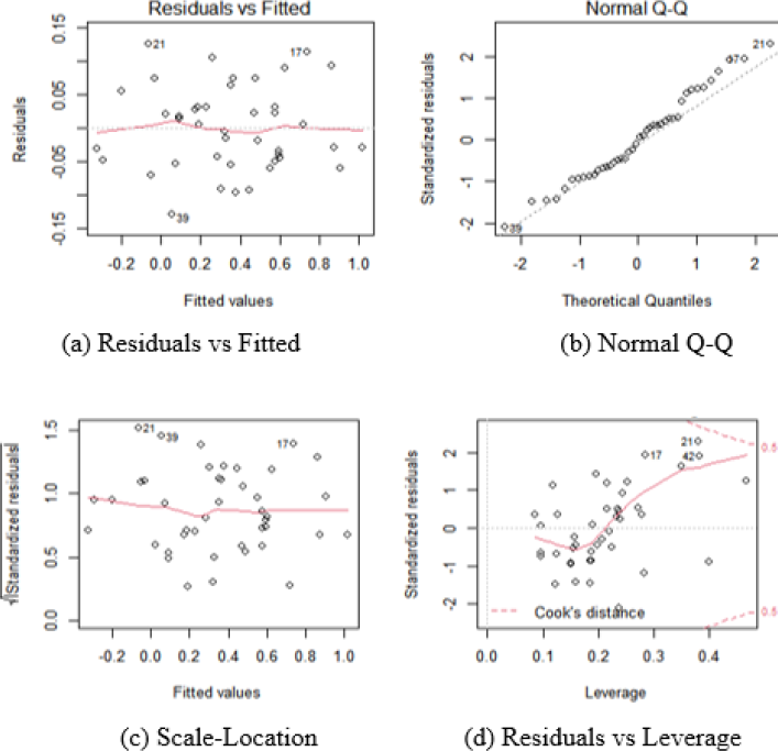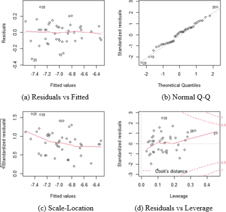 For model (4), R2 = 0.8544 and the F-value =42.26 with p-value < 4.39e-14 were obtained. Through the Breusch-Pagan test, no evidence of heteroscedasticity was found at a confidence level of 99.9% and the value of the Breusch-Pagan statistic equal to BP=6.1759. The normality of the errors was verified using the Shapiro-Wilk test at a confidence level of 99.9% and with the value W=0.98452 for the Shapiro-Wilk statistic. Finally, no evidence of error correlation was found using the Durbin-Watson test at a confidence level of 99.9% and the Durbin Watson statistic equal to DW = 2.0388. The results were visually corroborated by Figure 4.
