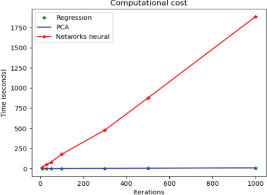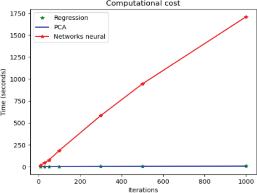 It can be observed that the models are equivalent with respect to the performance measure since the whiskers in the box plot intersect each other. Figure 6 presents the graphs of the times, as a function of the number of iterations, for each model. The graphs for principal component regression (PCA) and OLS regressions overlap, and the computational cost is considerably cheaper for PCA and OLS than for neuronal network regression.