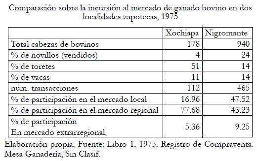 Las diferencias en los porcentajes de novillos, toretes y vacas vendidas por los productores locales en los distintos tipos de mercado arrojan pistas sobre la forma en que dependieron de los ganaderos de Playa Vicente. Un número reducido de productores tuvieron el capital requerido para engordar animales de más de 350 kilos (novillos) si observamos la tabla nos percataremos que en Xochiapa el porcentaje es menor que en el Nigromante. También, el número de productores que tuvieron acceso a los mercados extrarregionales en Xochiapa es menor que en el Nigromante. Hay que aclarar, aunque este dato no se desglosó en la tabla, que en 1975 los ganaderos de Playa Vicente mantenían todavía una red de clientes en cada pueblo, que se había formado desde años atrás. En Xochiapa dicha red incluía entre 8 y 10 familias, quienes acaparaban también parcelas ejidales de mayor extensión y podían, ocasionalmente, vender directamente a los introductores de carne de los mercados urbanos extrarregionales. Con anterioridad, dichas familias se dedicaron a la ganadería porcina y a la siembra de cultivos comerciales, luego, como mencioné en páginas anteriores, introdujeron bovinos.