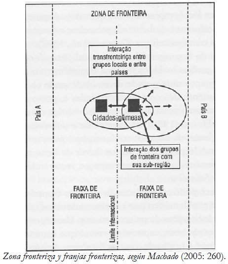 Detengámonos, en cambio, en la distinción fundamental entre frontera propiamente dicha ("border"), que no es más que la línea divisoria que separa dos o más Estados y provista de aduanas y otras formas de control de acceso, y la franja fronteriza ("border areas", "border of nations", "espace frontalier") que se abre de uno y otro lado de la primera en forma longitudinal, prolongándose hacia el interior de cada espacio nacional con profundidad variable aunque sin límites precisos (Machado, 2005: 260). La frontera es simplemente una línea político-administrativa que se mide en términos de longitud, pero no de anchura. La franja fronteriza, en cambio, es un territorio. Ambas nociones son, por supuesto, indisociables, pero constituyen conjuntamente el marco de lo que podríamos llamar fenómenos fronterizos.