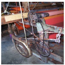 ... antes urdíamos bajando toda la gente del taller, y cuando estuvimos ahí al lado del Paricutín, dos hombres estaban moviendo el julio con varas, a mano, y todos los demás (estábamos) para alinear los hilos... (Se usaba) un peine largo con los hilos aquí y aquí, para que quedaran derechitos... dos moviendo, dando vuelta... y los demás a bajar hasta la calle... jalando para dar tensión y enrollando el hilo. Así hicimos los primeros, enrollados... Entonces cuando nos cambiamos a donde había fuerza eléctrica, entonces hubo posibilidades de usar energía, y un malacate hecho con un eje trasero de un Jeep y con la caja de velocidades de un (automóvil marca) Volvo, y así logramos el enrollador que tiene años trabajando... Nunca le hemos cambiado nada, y sigue funcionando... Ora pensando en el urdidor anterior, tradicional, yo creo sería un reto para nosotros hacer una tela de 15 metros de largo, porque tenía sus detalles... (Walter, 13 julio 2006).