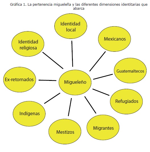 Sin embargo, la identidad migueleña, que en el ámbito local excluye a los mestizos, en el contexto migratorio se amplía para la creación de redes entre "migueleños" de Guatemala, de México y los que ya residen o están temporalmente en Estados Unidos y Canadá. En las diferentes entrevistas hechas en campo a quienes han regresado del contexto migratorio, éstos dicen haberse apoyado en familiares o conocidos de su comunidad actual, es decir, que se activa la identidad y la pertenencia a La Gloria, a San Francisco y a Nueva Libertad, ahora comunidades mexicanas; pero en los lugares de acogida en Estados Unidos, se relacionan y se apoyan en una red que, más que llamarse guatemalteca, se define como "migueleña". Incluso los mestizos de las comunidades de estudio se apoyan en esa misma "red migueleña", que han construido también en el contexto del refugio.