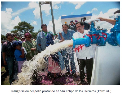 El agua mucha o poca ha dejado de ser un bien cuyo destino exclusivo está orientado a la sociedad local que la consume; el agotamiento de estas fuentes ha obligado a la perforación de pozos profundos que requieren de tecnología no sólo para la horadación, sino para la extracción y distribución del líquido a través de infraestructura hidráulica cuyo control rebasa las instancias y el control locales, lo cual está gestando situaciones de fuerte descontento.15