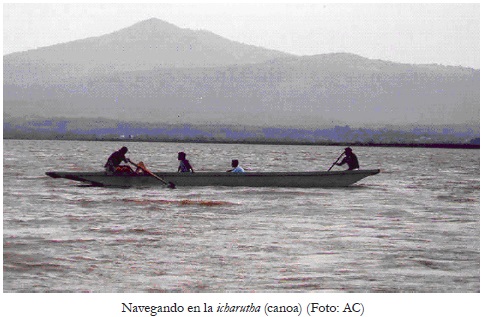 Los pobladores de las islas y de la ribera hablan de ciclos de alrededor de cincuenta años durante los cuales baja su nivel, para luego recuperarse;4 además, tienen un claro conocimiento de las oscilaciones en función de los ciclos lunares y de la influencia de éstos en la pesca (Argueta, 2008: 171). Los pescadores también reconocen las variaciones en la presencia de los peces a lo largo del año y ubican lugares específicos de donde estos "salen"; así sucede con el cerro de la acúmara, que debe su nombre al hecho de que se cree que en su interior se forman los peces de esa especie para adentrarse a la laguna a través de un arroyo que fluye desde dentro de dicho cerro. De manera similar a las creencias en torno a entidades anímicas que habitan en el bosque y son considerados dueños de ciertos lugares, en la laguna la jápingua, personaje relevante en el universo simbólico de los p'urhepecha, figura como el rey, el dueño o protector de los peces (Velásquez, 1947:85). En la tradición oral de pueblos purépecha, sobre todo los asentados en la zona lacustre, la laguna forma parte de la trama de relatos que hablan de su origen, de los seres que en ella habitan y de ciertos eventos que tuvieron lugar ahí. Al transmitirse en el ámbito familiar y comunitario, no sólo dejan ver la importancia de la laguna en el sistema de conocimiento y de creencias, sino también van actualizando el sentido etimológico que suele tener este tipo de piezas narrativas.