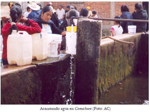 Las respuestas comunitarias ante estos conflictos también han sido diversas: unas evidencian una mayor capacidad por parte de las instancias de organización local en la resolución y definición de estrategias para garantizar el abasto del agua, en tanto que en el otro extremo se ubican los casos en los cuales el control ha sido transferido casi en su totalidad a instancias que quedan fuera del alcance de las instituciones locales. Entre las primeras destacan las experiencias promovidas en diversos pueblos de la Meseta (San Felipe de los Herreros, Nahuatzen, Cheranatzicurin, entre otros) en las cuales la gestión local se ha acompañado de procesos de fortalecimiento de instancias de organización comunitaria; son procesos que no se limitan a la gestión de la obra hidráulica que se requiere para la obtención del agua, sino también a su manejo, mantenimiento y control social. Mucha tinta se ha utilizado para documentar la problemática del agua y seguramente mucha más queda aún en el tintero. Es importante buscar, en el registro puntual de conflictos y experiencias en torno al manejo y gestión de agua, exitosas o no, alternativas de solución a este problema que, aunque se refleja en el ámbito comunitario, no puede desligarse de factores políticos, sociales y económicos.11
