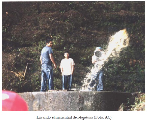 5 Por ejemplo, uno de los manantiales que surten de agua al pueblo de Angahuan, es el sitio donde, previo al Carnaval, se congregan dos de las autoridades tradicionales de alta jerarquía con sus respectivos acompañamientos: deberán lavarlo y habilitarlo en cumplimiento de una de sus obligaciones principales. De este manantial, ubicado en el cerro de Uékato, procede el agua que se lleva al Iurixhio para distribuirla en ocasión del reparto ritual del agua, las noches del jueves y viernes de la Semana Santa, ceremonia con la que el Pitapi concluye con las obligaciones encomendadas por el orden ceremonial de su comunidad. Este manantial también es el sitio donde deberá debería bañarse a la novia antes de su boda, obligación que recae en un grupo de mujeres encabezado por quien habrá de ser su suegra y familiares más cercanos.