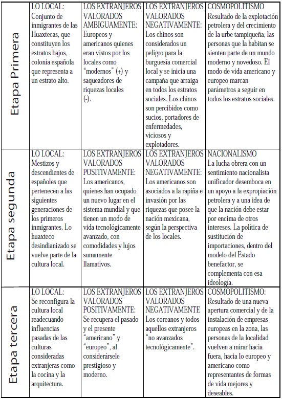 En el caso que estoy presentando aquí, debo afirmar que el cosmopolitismo es asumido como una competencia cultural que eleva el prestigio social. Esto se debe, en primer lugar, al hecho de que la región y los municipios que antes estaban comprendidos dentro de lo que a principios del siglo XX se denominaba Tampico, alcanzan su desarrollo más importante con la explotación petrolera. En efecto, si bien es cierto que este espacio nace como resultado de su posición estratégica para el desarrollo comercial en el siglo XIX, es indudable que su importancia y crecimiento, así como gran parte de su configuración cultural, se deben a las personas que llegaron con el descubrimiento y explotación del combustible fósil desde diversos lugares del mundo, del país y principalmente de las Huaxtecas.