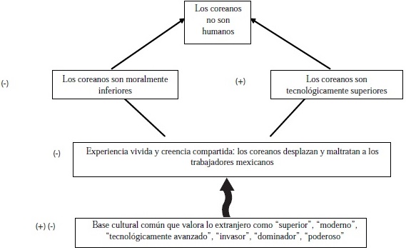 Este conjunto de creencias reflejan un sentimiento de desprecio, pero, paradójicamente, también reflejan un sentimiento de inferioridad con respecto al coreano, no sólo referido a la inferioridad real en las relaciones de poder que el trabajador local sentía y comprobaba en el ámbito laboral, sino referido sobre todo a la superioridad tecnológica de los coreanos, superioridad confirmada a través de los medios masivos de comunicación.
