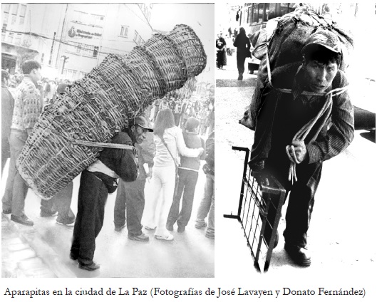 En la urbe andina, en un polo se sitúa el cuerpo que denota mayor ausencia de modernidad y que está marcado por la espalda, emblema del aparapita (cargador) que suplanta medios de transporte en las ciudades, a las que llega provisional y temporalmente sin haber pasado por el proceso de humanización. Su presencia en las calles representa, pues, al lari o salvaje extrañado del espacio más ruralizado del territorio nacional, ajeno casi por completo a la racionalidad del mundo urbano, pero útil a su dinamismo comercial, justamente materializado por las mujeres indígenas antes descritas, unas con mayor éxito que otras. El aparapita es el portador del "desentendimiento" lumpenproletario y, en esa condición, es devaluado por su torpeza corporal, por su incapacidad para interactuar en los formatos políticos, sociales y culturales de la sociedad urbana y moderna, a la que, sin embargo, su capacidad física no normalizada le es fundamental.11