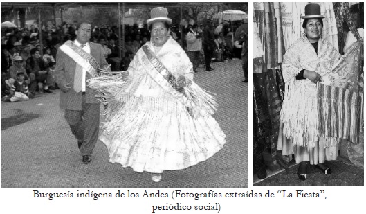 En el otro frente están los cuerpos migrantes que si bien son eminentemente manuales, están señalados por el éxito material de su ascenso social. Convertido en el soporte de una nueva burguesía, de carácter comercial, reflejan su incorporación a la esfera económica de la dominación, con una vestimenta compuesta por la pollera y la manta de costoso valor monetario, a las que se agrega el uso del sombrero "borsalino", sugiriendo, con el envoltorio del cuerpo de "alta sociedad", su capacidad para adquirir la segunda piel, ciertamente de origen feudal, pero en su caso de gran lujo y ostentación.12 Entre ellas, el cuerpo engrosado por el bienestar señala también una marca de distinción social, confluyendo con la histórica representación de la burguesía europea emergente en el siglo XVI y de la cual, tardíamente, ésta parece ser casi un espejo.13 Como aquella, la exhibición del poder económico se ritualiza en las festividades patronales, manifestación simbólica del espacio público emergente que rememora y contemporiza la cena anual del Príncipe, como el 'lugar" donde informalmente se construye la dominación (Barragán, 2004).14