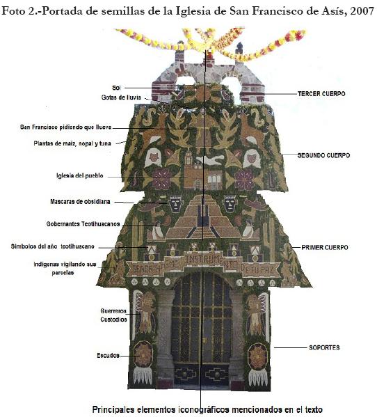 Como se aprecia en la Foto 2, la portada de la iglesia de San Francisco tiene la forma de un típico basamento teotihuacano de tres cuerpos trapezoidales, además de dos largos soportes de madera que le proporcionan la altura suficiente para enmarcar la puerta principal del templo. Cada cuerpo está decorado íntegramente con mosaicos hechos de frijol, maíz, semillas de flor de calabaza, girasol y bledos, pegados sobre bloques de unicel que a su vez están clavados en una estructura de madera de pino, lo que hace que la portada sea ligera y fácilmente desmontable.