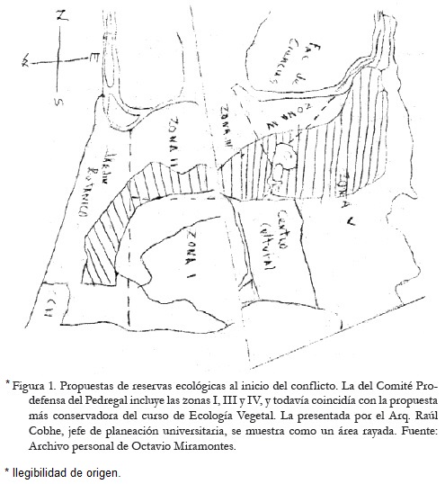 En esas reuniones iniciales con las autoridades quedaron claramente plasmadas dos posiciones en abierto conflicto. Lo interesante es que ambas incluían ya la posibilidad de establecer en CU una reserva ecológica. Un bosquejo generado por el Comité Pro-defensa posteriormente a este encuentro resume estas posiciones, y por su valor histórico lo mostramos aquí.