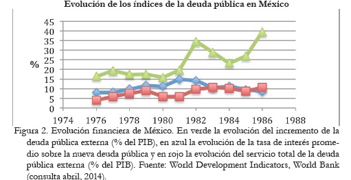 En agosto de 1982 ocurrió un hecho histórico que frustró el proyecto nacional de soberanía y transformó radicalmente a México. La efervescencia desarrollista mexicana se enfrió rápidamente cuando Ronald Reagan decidió cambiar la estrategia petrolera y monetaria de los Estados Unidos, provocando la caída de los precios internacionales del crudo y el aumento de las tasas de interés sobre el servicio de la deuda (Figura 2). Como consecuencia, se precipitó una fuga de capitales y la deuda mexicana se volvió impagable, por lo que en agosto de 1982 el gobierno debió declarar una moratoria temporal unilateral. Dejó así de ser el cliente consentido y pasó a ser un deudor insolvente, un paria internacional que "por su conducta irresponsable" desató una de las peores crisis económicas de la historia contemporánea, que afectó a más de cuarenta países en desarrollo (Sachs, 1986). La deuda mexicana tuvo que ser refinanciada y sostenida con nuevos préstamos, lo que aumentó permanentemente el servicio de la deuda como proporción del PIB, a pesar de que las tasas de interés disminuirían eventualmente. A partir de ese momento México quedó sujeto definitivamente a las políticas de austeridad del FMI, de las que no hemos podido librarnos.15