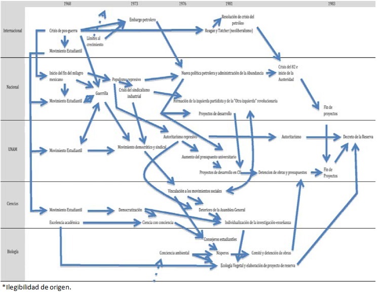 Durante la década de los 70s y hasta el inicio de los 80s del siglo pasado la generación de los profesores y estudiantes (físicos, matemáticos y biólogos) de la Facultad de Ciencias combinaba una reconocida capacidad académica con un firme compromiso con la democratización y la transformación socialista de la universidad y el país. Las causas más profundas de esta singular combinación se enmarcan en el anticolonialismo de los 60s y 70s, representado por la revolución cubana y la guerra de Vietnam, así como por el movimiento del 68 que se expandió en todo el mundo al expresar la profunda frustración que las nuevas generaciones experimentaban con el fracaso de las políticas de posguerra para avanzar en la democracia, la liberación de los pueblos y las mejoras sociales prometidas (Fontana i Lázaro, 2011). Para el desarrollo de esta conciencia crítica también fueron importantísimos los hechos y efectos de la Guerra Sucia en el país: durante el régimen de Luis Echeverría Álvarez (1971-1976) y López Portillo más de 500 jóvenes ligados a las guerrillas urbanas y rurales fueron desaparecidos o muertos como parte de la respuesta de los intereses políticos nacionales a las presiones de la guerra fría en la lucha contra el "comunismo"(Mendoza García, 2005; Morales Hernández, 2007).8 Ya que la suciedad de esta guerra pudo ocultarse eficazmente a nivel nacional e internacional, México pudo ser conocido como la dictadura perfecta por las características excepcionales de su ejercicio del poder autoritario,9.10