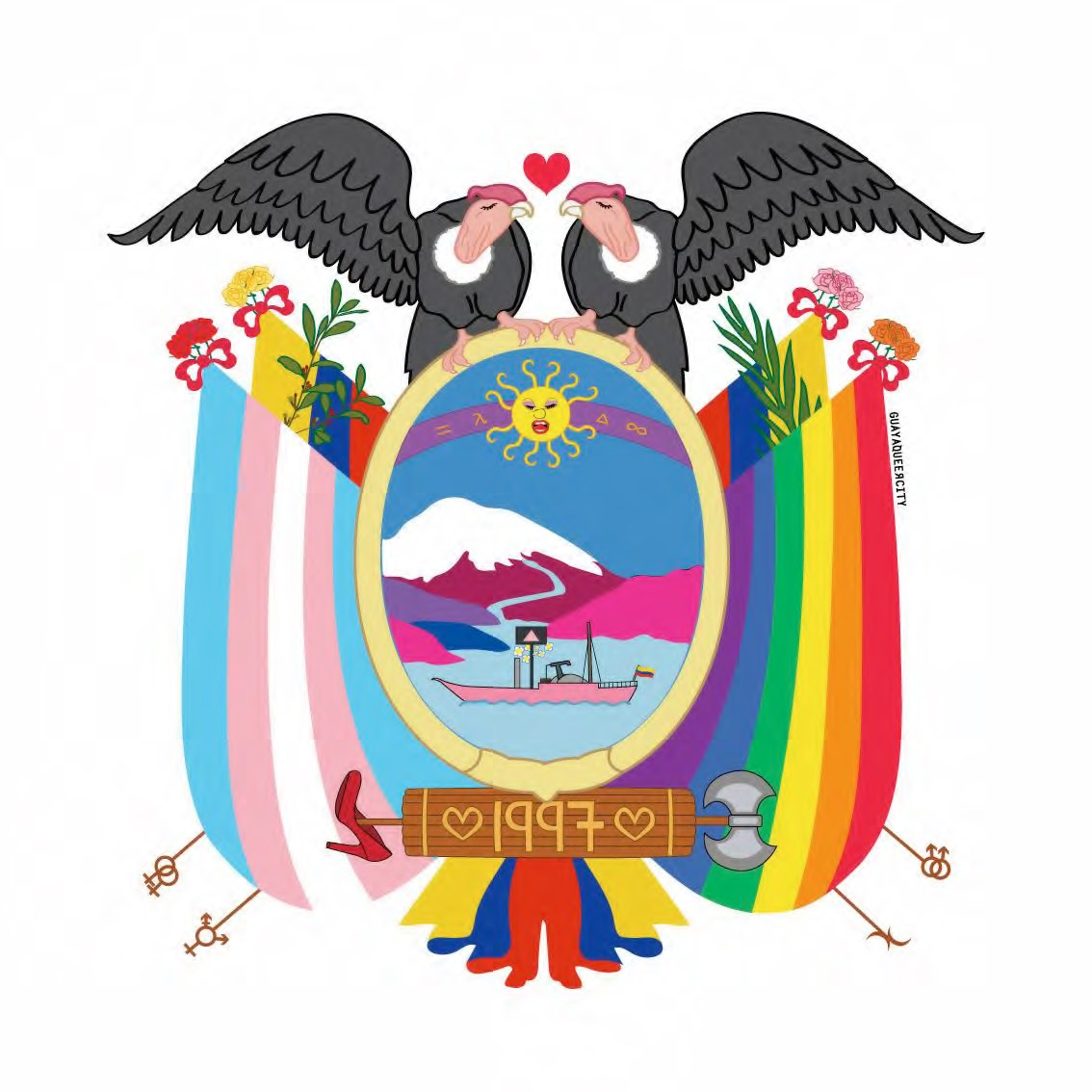 Una de las herramientas divulgativas del colectivo Guayaqueer City es la ilustración. Para la conmemoración de la despenalización hicieron público una versión queerizada del escudo nacional ecuatoriano (figura 4).