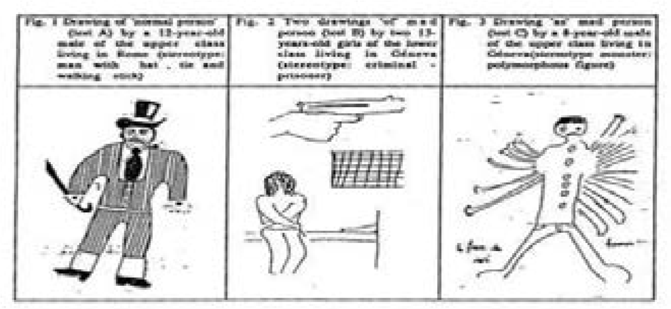 De Rosa (1987, 1994) desarrolló un programa de investigación sobre representaciones sociales de la locura por niños y adolescentes. Les pedía que dibujaran un loco. Tres categorías resultaron de los dibujos: (1) representaciones mágico-fantásticas - la locura como posibilidad creativa (objetivada como un artista, o un excéntrico) y como algo monstruoso, diabólico (un diablo, un mutilado); (2) representaciones criminalizadas como desvío, desde el rompimiento con las normas hasta la violencia (terrorista con una bomba, una persona desvistiéndose en la calle); (3) representaciones medicalizadas (alguien en la silla de ruedas, o con alucinaciones). Al parecer, estas imágenes han permanecido en el imaginario colectivo durante los últimos cuatro o cinco siglos y contradijeron las respuestas verbales de los niños y adolescentes. Así, ellas “aportaron evidencia del núcleo figurativo y de dimensiones simbólicas arcaicas inherentes a la locura” (Duveen y De Rosa 1992, 102). Ver Figura 3.