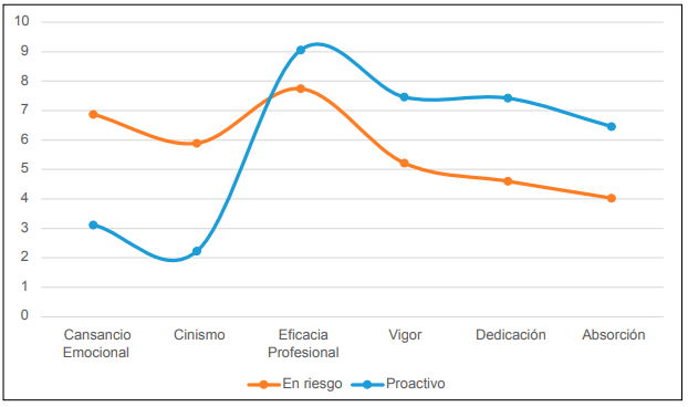 El primer conglomerado (25.8 %; n = 38) agrupa a las personas que presentan elevados niveles de cansancio emocional y cinismo, factores centrales en el síndrome de burnout, por lo que este perfil fue denominado “en riesgo”. Por su parte, en el segundo conglomerado (74.2 %; n = 109) predominan el engagement y la eficacia profesional, aspectos positivos vinculados al trabajo, por lo que este grupo fue identificado como “proactivo”. Cabe señalar que ambos perfiles no mostraron asociaciones significativas con las variables de base, lo que muestra que no hay distinción en cuanto a género, edad, antigüedad, estado civil o nivel de instrucción, entre ellos.