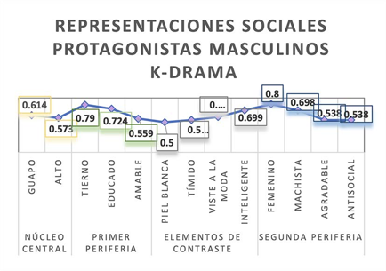 La teoría de las representaciones sociales implica un sistema jerarquizado y organizado, compuesto por dos subsistemas interactivos: un sistema central y uno periférico. Los resultados de la representación asociada al protagonista masculino de las series de k-dramas y mexicanas juveniles mostraron algunas similitudes e importantes diferencias.