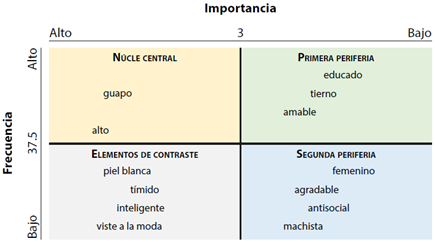 A partir del análisis de la información contenida en la tabla 3, se construyó el modelo de núcleo central, así como la zona de contraste y las periferias. En la figura 2 se muestra que en el núcleo central (cuadrante superior-izquierdo) se encuentran los conceptos: guapo, rico, divertido y fornido. Estos cuatro atributos constituyen el anclaje principal de la representación analizada y definen la identidad de la representación social de los protagonistas masculinos de las series mexicanas juveniles.