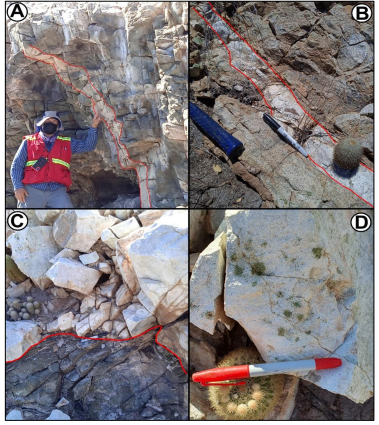 Figura 3 (A) Dique aplítico de 30 cm de espesor, inyectado en el dioritoide, estos son posibles alimentadores de los diques félsicos presentes en la isla; (B) Dique aplítico de 10 cm de espesor cortando al granitoide. (C) Dique félsico de grano medio con un espesor aparente de 4 metros que corta al dioritoide. (D) Acercamiento en el dique donde se aprecian los parches de epidota.
